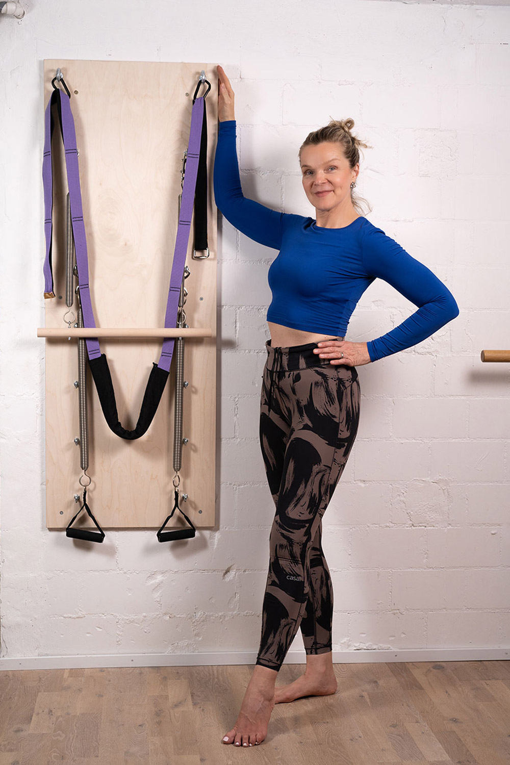 Pleasant to the touch natural birchwood roll down bar ca 59 cm with two hooks for use with choice of arm or leg springs. Highly durable set of two Triangle Grips in polyester neoprene mix. The anti-slip soft 11 cm material ensures high training comfort.